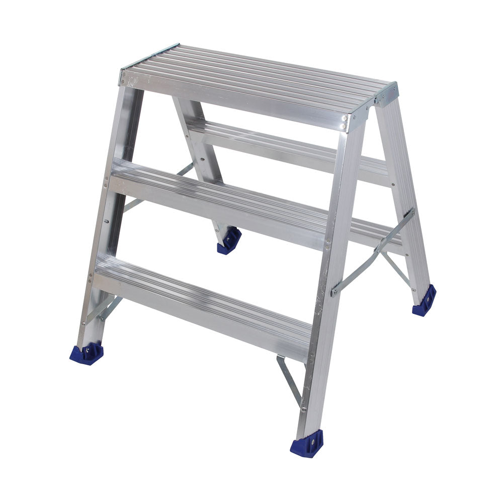 En stabil och rejäl arbetsbock tillverkad av aluminium. Arbetsbock 4250 har hydralnitade steg och en väl tilltagen plattform. Plattformens mått är 605x250mm och stegets djup är 81mm med dom kraftiga glid och golvskydden står bocken stabilt mot underlaget. Samtliga ben är förstärkta med stag mellan vagnstycke och steg, förstärkningen ger en ökad livslängd på bocken. Arbetsbocken finns i 4 höjder