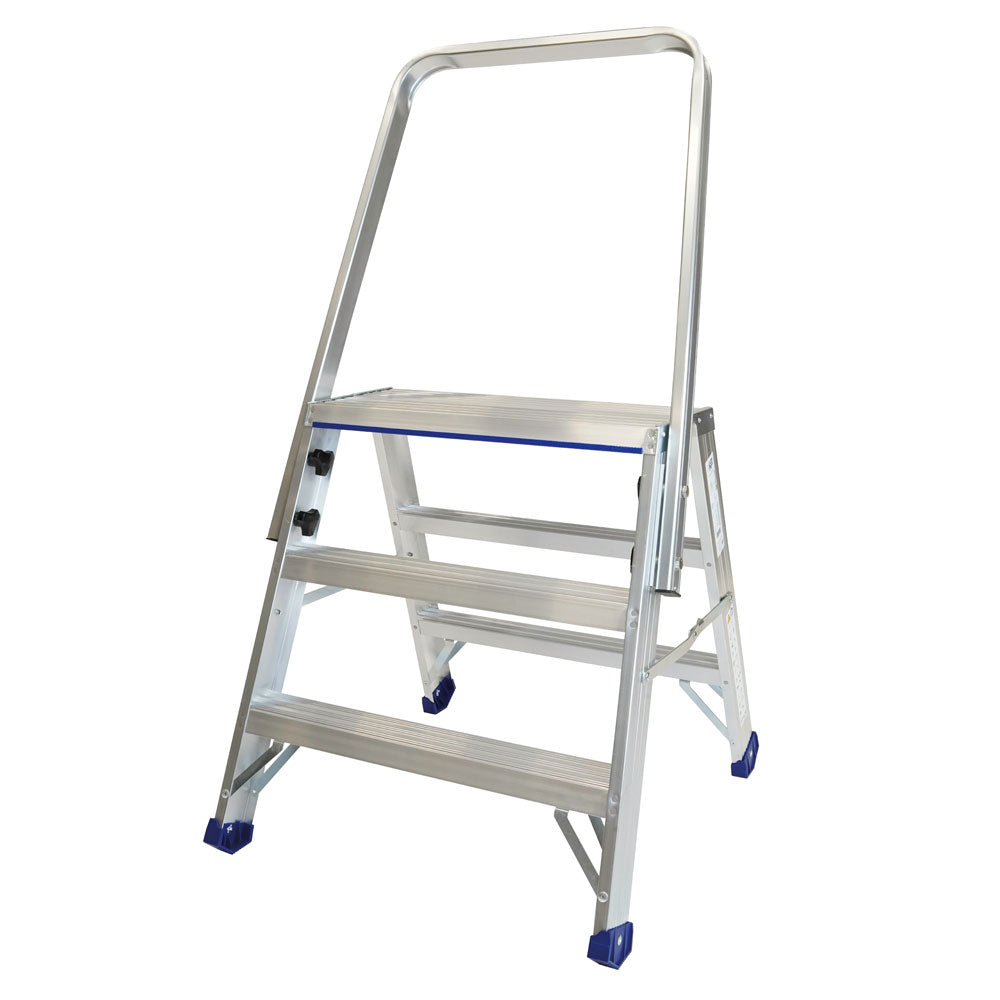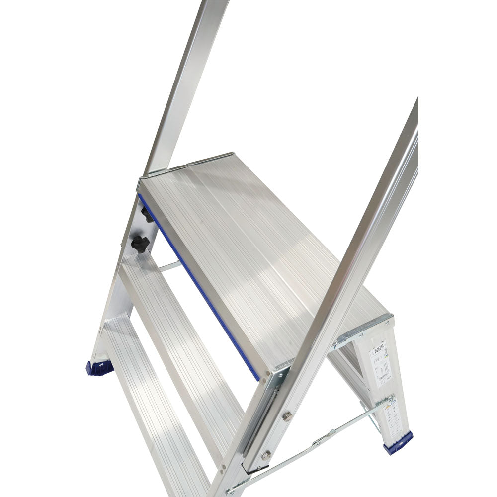 En stabil och rejäl arbetsbock med säkerhetsbåge tillverkad av aluminium. Säkerhetsbågen gör att du arbetar ännu stabilare från översta plattformen. Uppfyller även Bra Arbetsmiljöval nivå 2. Arbetsbock 4250 har hydralnitade steg och en väl tilltagen plattform. Plattformens mått är 605x250mm och stegets djup är 81mm med dom kraftiga glid och golvskydden står bocken stabilt mot underlaget. Samtliga ben är förstärkta med stag mellan vagnstycke och steg, förstärkningen ger en ökad livslängd på bocken. Arbetsbocken finns i 3 höjder.