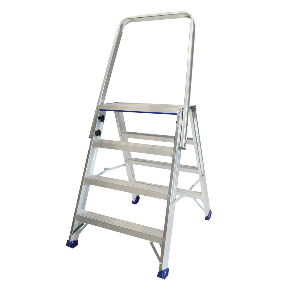 En stabil och rejäl arbetsbock med säkerhetsbåge tillverkad av aluminium. Säkerhetsbågen gör att du arbetar ännu stabilare från översta plattformen. Uppfyller även Bra Arbetsmiljöval nivå 2. Arbetsbock 4250 har hydralnitade steg och en väl tilltagen plattform. Plattformens mått är 605x250mm och stegets djup är 81mm med dom kraftiga glid och golvskydden står bocken stabilt mot underlaget. Samtliga ben är förstärkta med stag mellan vagnstycke och steg, förstärkningen ger en ökad livslängd på bocken. Arbetsbocken finns i 3 höjder.