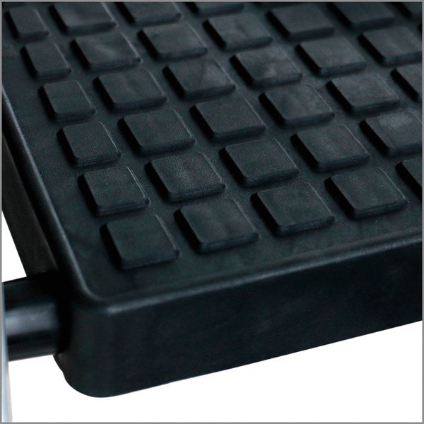 En robust trappstege med stabil plattform. Breda halkskyddade steg.