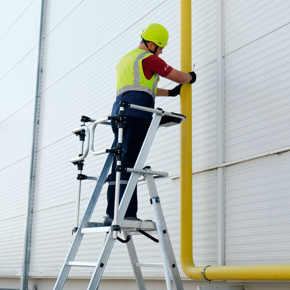VEROX - Teleskopisk hopfällbar arbetsplattform är helt tillverkad av aluminium och designad för professionellt bruk. Den har vikbara räcken.