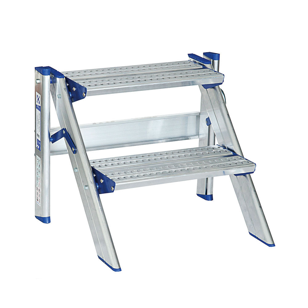 Trappa APO är marknadens stabilaste ihopfällbara trappa. Tillverkad i aluminium. För smidig hantering finns handtag monterat. 250 mm djup stegyta med genomsläpp för smuts och snö samt kraftiga räfflor för bättre halkskydd. Basbredd 600 mm. Viks ihop till ett platt paket