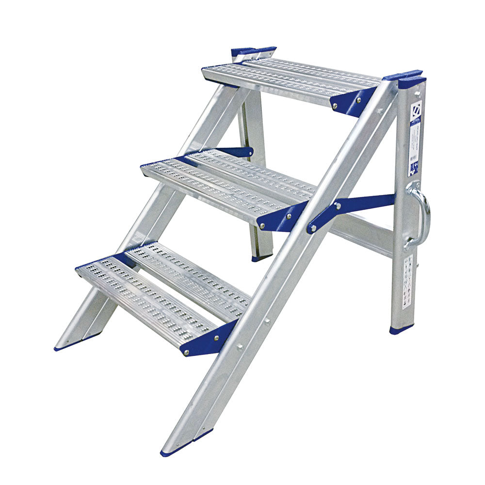 Trappa APO är marknadens stabilaste ihopfällbara trappa. Tillverkad i aluminium. För smidig hantering finns handtag monterat. 250 mm djup stegyta med genomsläpp för smuts och snö samt kraftiga räfflor för bättre halkskydd. Basbredd 600 mm. Viks ihop till ett platt paket